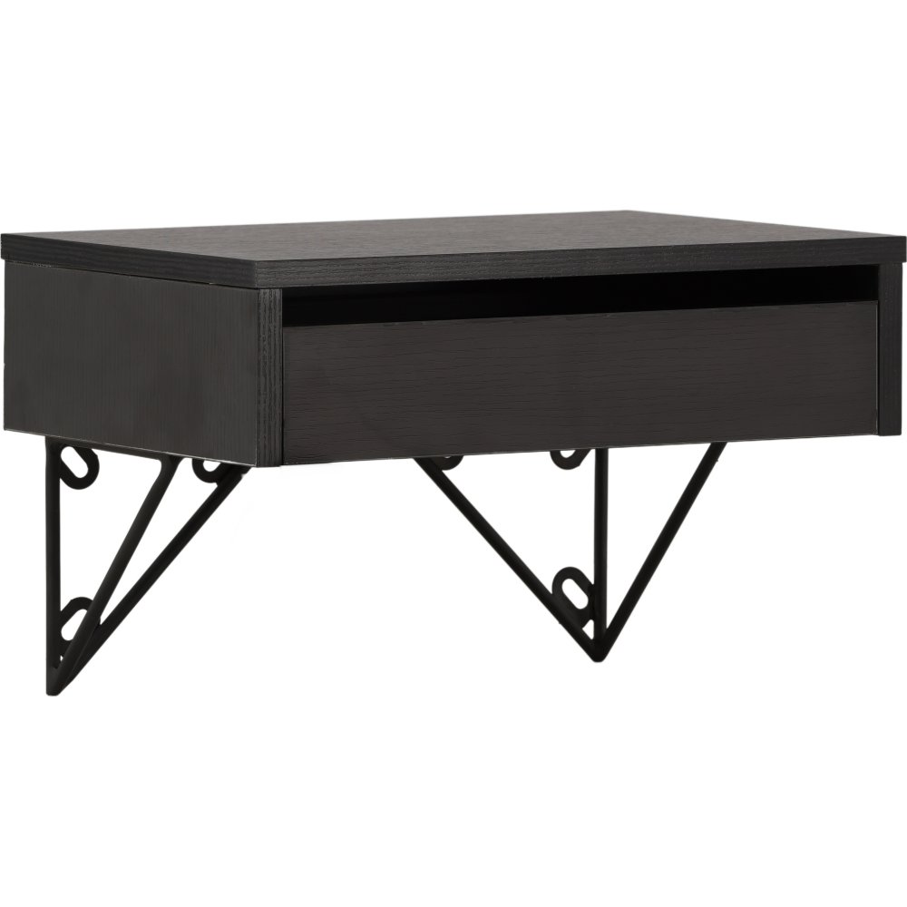 Ett charmigt sidobord som passar perfekt att hänga på väggen bredvid sängen, soffan eller varför inte i hallen? Det här smakfulla sidobordet i sotad svart MDF har en svart stålställning och en låda för dold förvaring. Den jordnära kulören och dekorativa upphängningen ger dig ett iögonfallande sidobord.