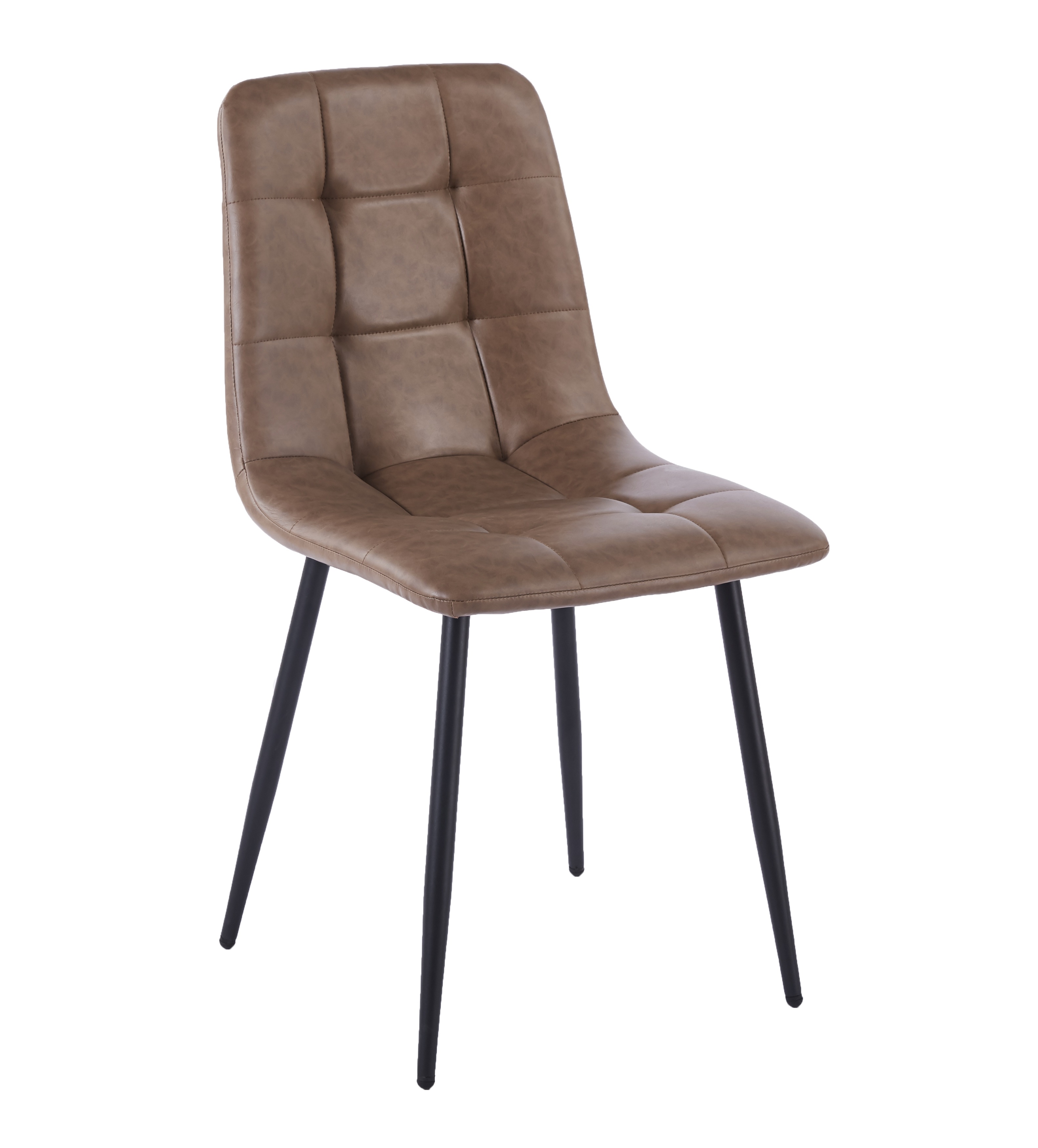 Till bordet matchar fyra Delta matstolar i brunt vintage-konstläder. Klädseln har en vacker patinerad yta som ger en varm, inbjudande känsla, medan de svartlackerade metallbenen tillför en modern kontrast och stabilitet. Kombinationen av det ljusa bordet och de mörka stolarna skapar en balanserad helhet med både elegans och karaktär.