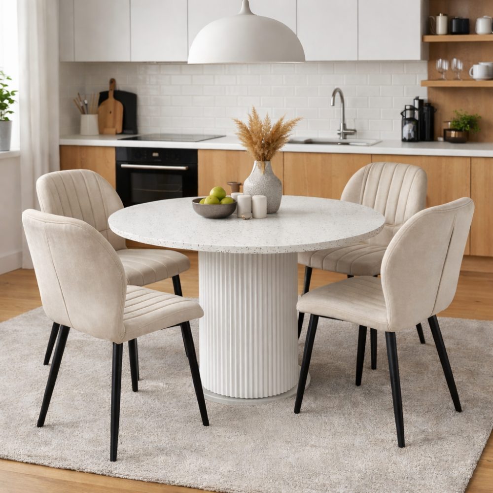Matgrupp Sandö matbord Ø120cm i vit terazzo med 4st Santos matstol i beige velvet