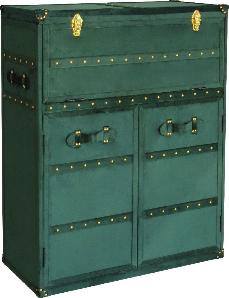 Klassiker inom inredningsvärlden. Petit koffert med förvaring och utfällbar skiva med inbyggd spegel. Kan användas som sminkbord, barskåp och skrivbord. Kofferten är klädd i en snygg mörkgrön sammet med detaljer i mässing.