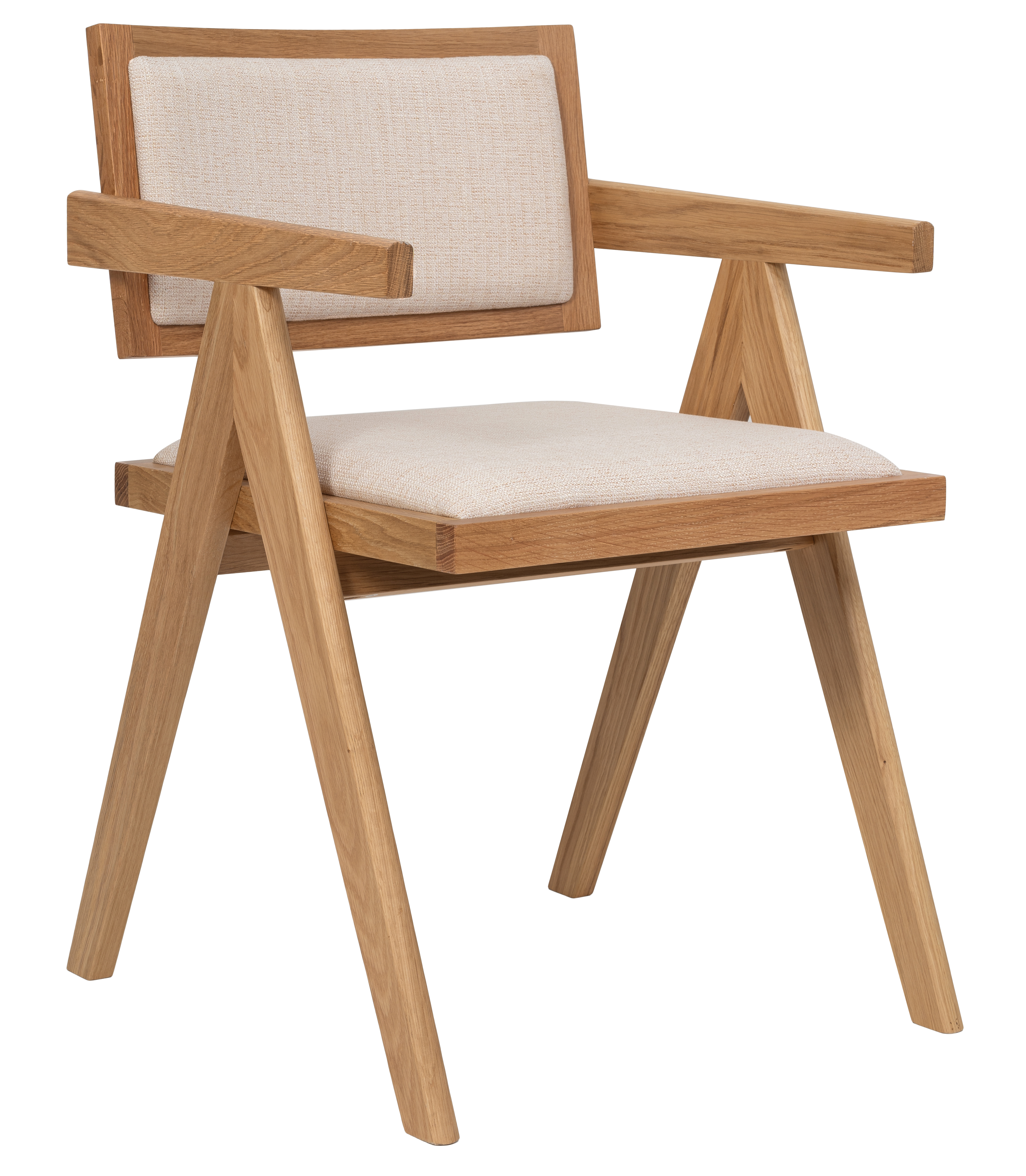 De fyra Sara karmstolarna kompletterar bordet med sin genomtänkta kombination av FSC-certifierat massivt ekträ och klädsel i linnefärgat tyg. Stolarna erbjuder god sittkomfort och ett harmoniskt uttryck som gör matgruppen lika lämplig för vardag som fest.