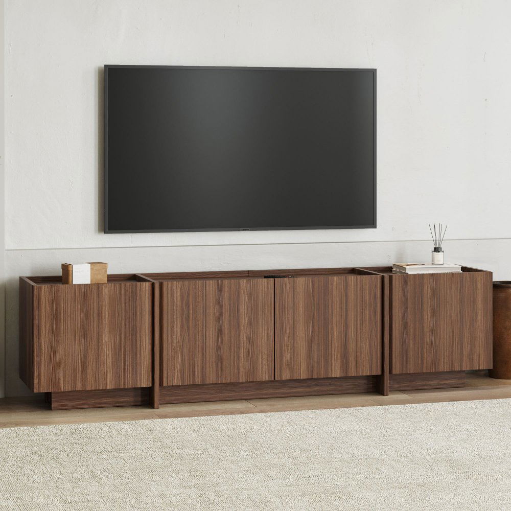 TV-bänken erbjuder praktisk förvaring bakom flera luckor där hyllplan gör det enkelt att organisera spelkonsoler, fjärrkontroller, kablar och andra medietillbehör. Luckorna är utrustade med soft-close gångjärn som gör att de stängs mjukt och tyst.